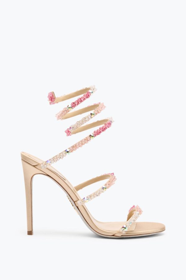 A playful twist on an iconic design, the Cinderella sandal is adorned with a crystal-embellished serpent, featuring intricate details and a variety of crystal sizes. The bright pink shade adds a feminine, joyful note.